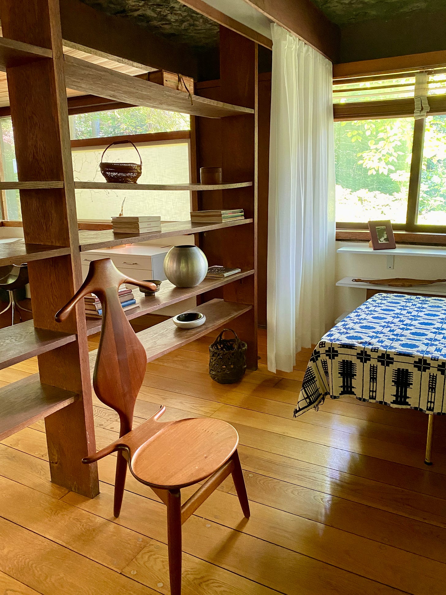 The Studio was Russel Wright’s personal space where he slept and worked. It illustrates many of the recurring themes at Manitoga including integration of the built and natural environment, the influence of Japanese design, the juxtaposition of natural and synthetic materials, and efficiency and functionality.